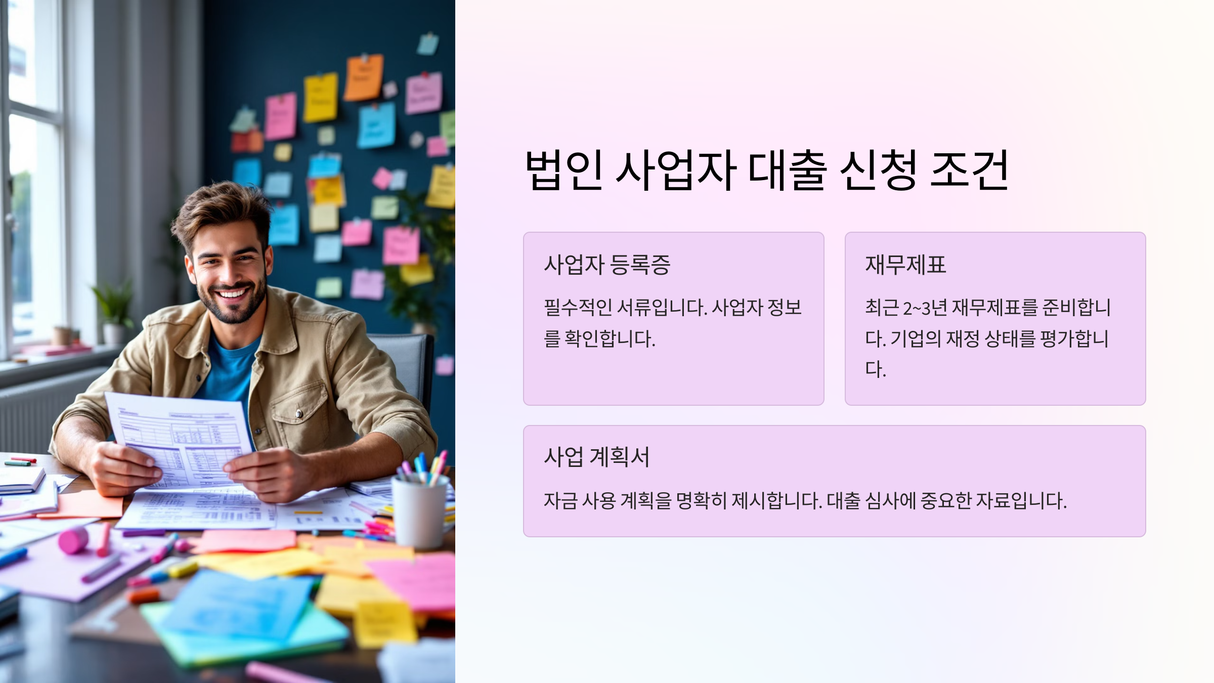 법인 사업자 대출을 신청하기 전, 위의 조건들을 사전에 확인하고 준비하면 대출 승인 확률을 높일 수 있습니다. 특히 신용 등급, 세금 체납 여부, 담보 제공 가능성 등을 미리 점검하는 것이 중요합니다.