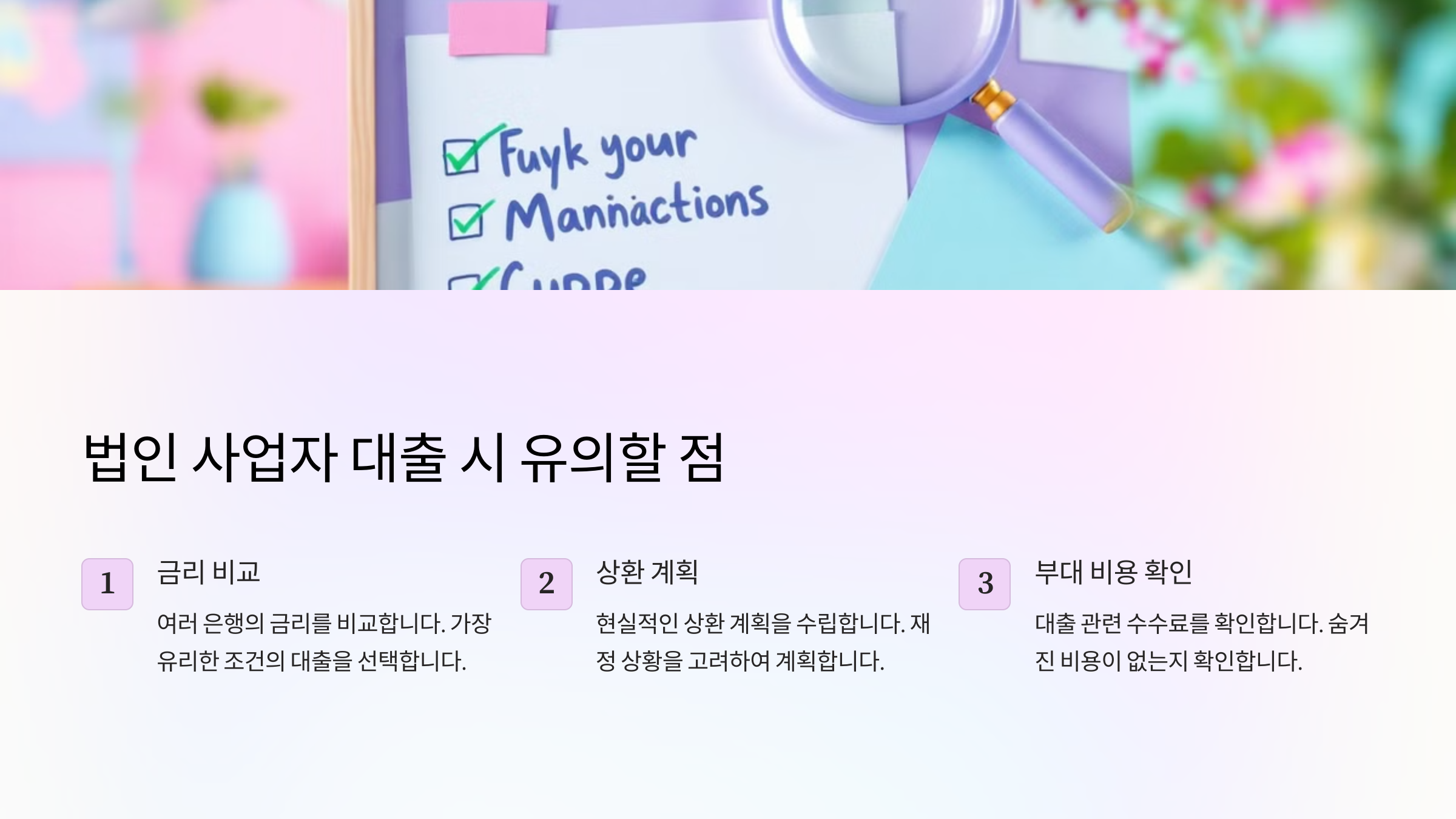 법인 사업자 대출을 신청할 때는 단순히 자금을 확보하는 것뿐만 아니라, 장기적인 재무 건전성을 고려해야 합니다. 무리한 대출이나 잘못된 금융 계획은 기업 운영에 부담이 될 수 있습니다. 다음은 대출 신청 시 반드시 고려해야 할 유의사항입니다.
