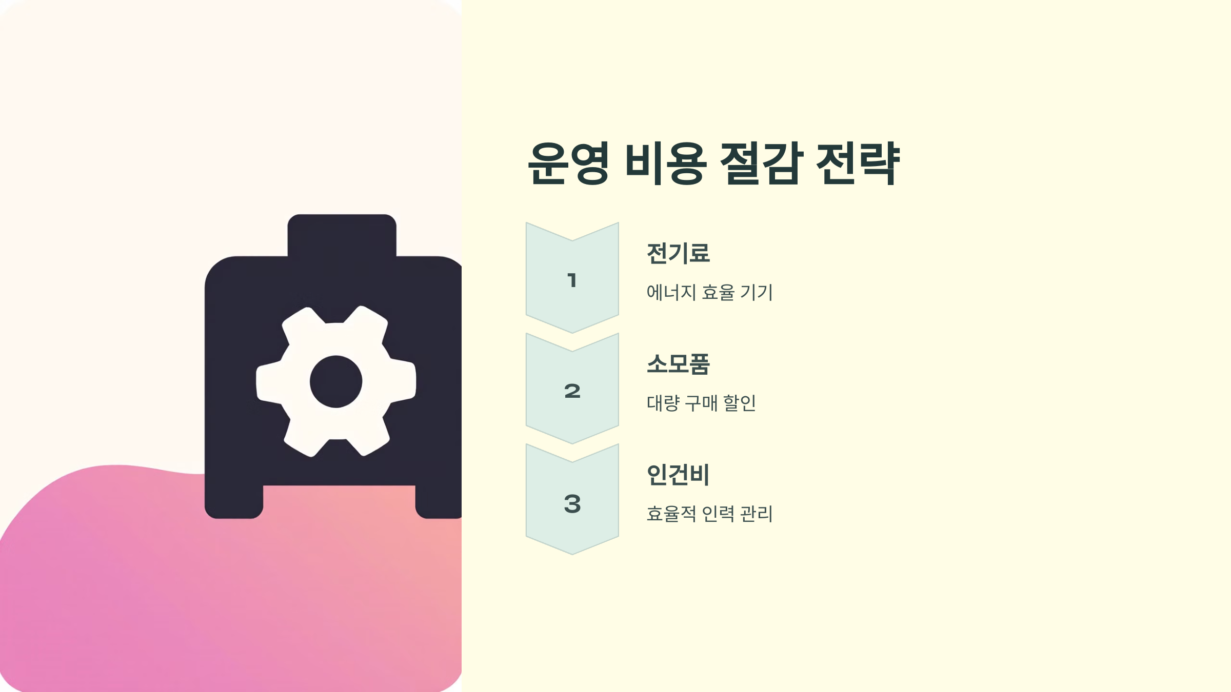 - 시설 유지보수비: 월 10만 원~50만 원 (기계 점검, 소모품 교체 등)