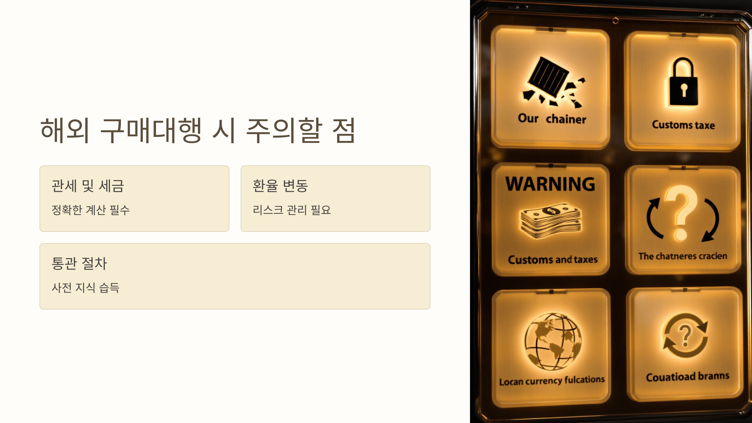 해외 구매대행 사업은 비교적 진입 장벽이 낮고, 소자본으로 시작할 수 있는 장점이 있지만 다양한 법적·운영적 리스크가 존재합니다. 구매대행을 성공적으로 운영하려면 관세, 통관, 환불, 가품 문제 등을 철저히 숙지해야 합니다.
