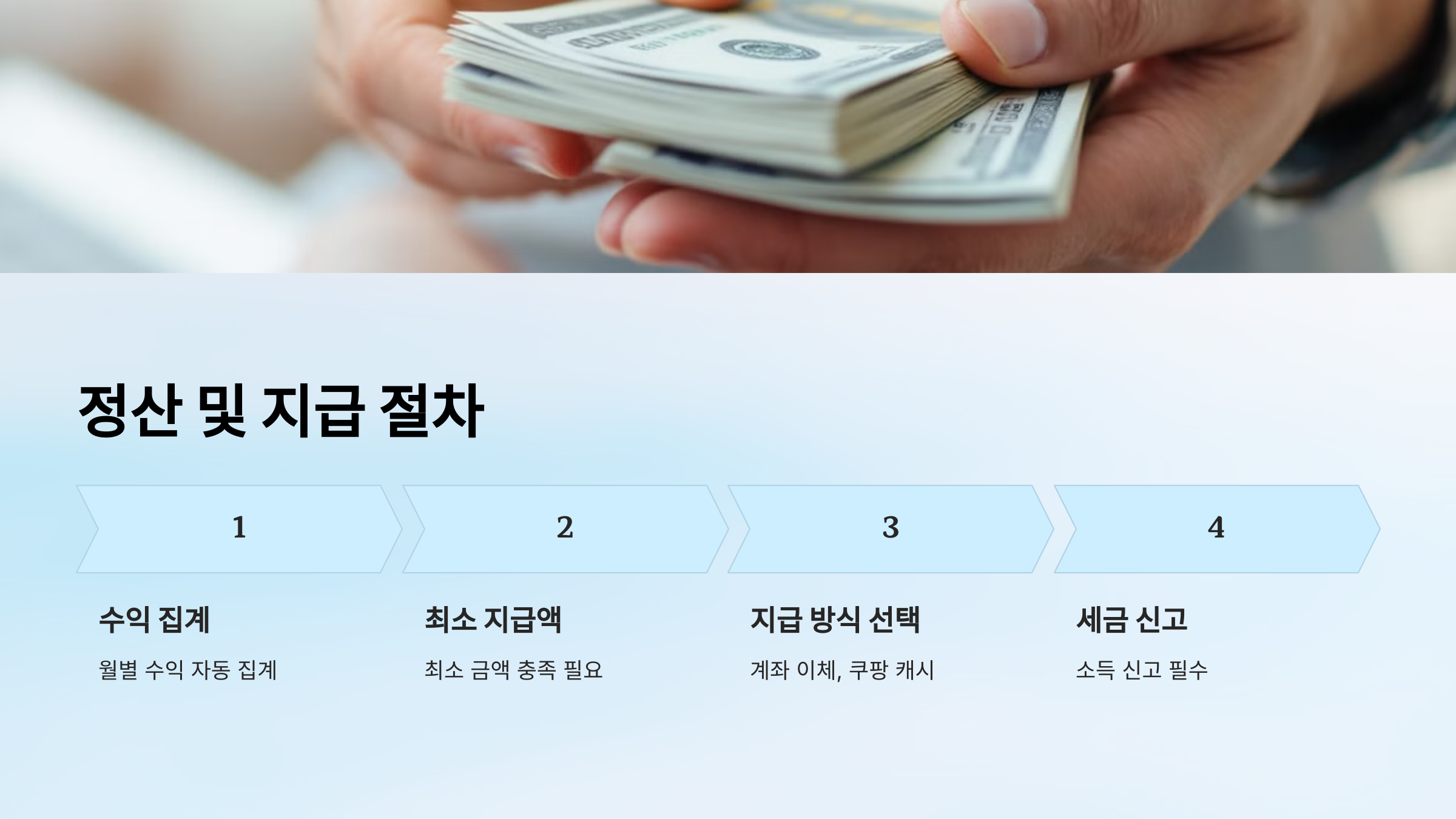 지급받기 위해서는 최소 1만 원 이상의 수익이 누적되어야 해요. 만약 한 달 동안 수익이 1만 원 미만이라면, 다음 달로 이월돼요. 정산이 완료되면 등록한 계좌로 자동 입금돼요.