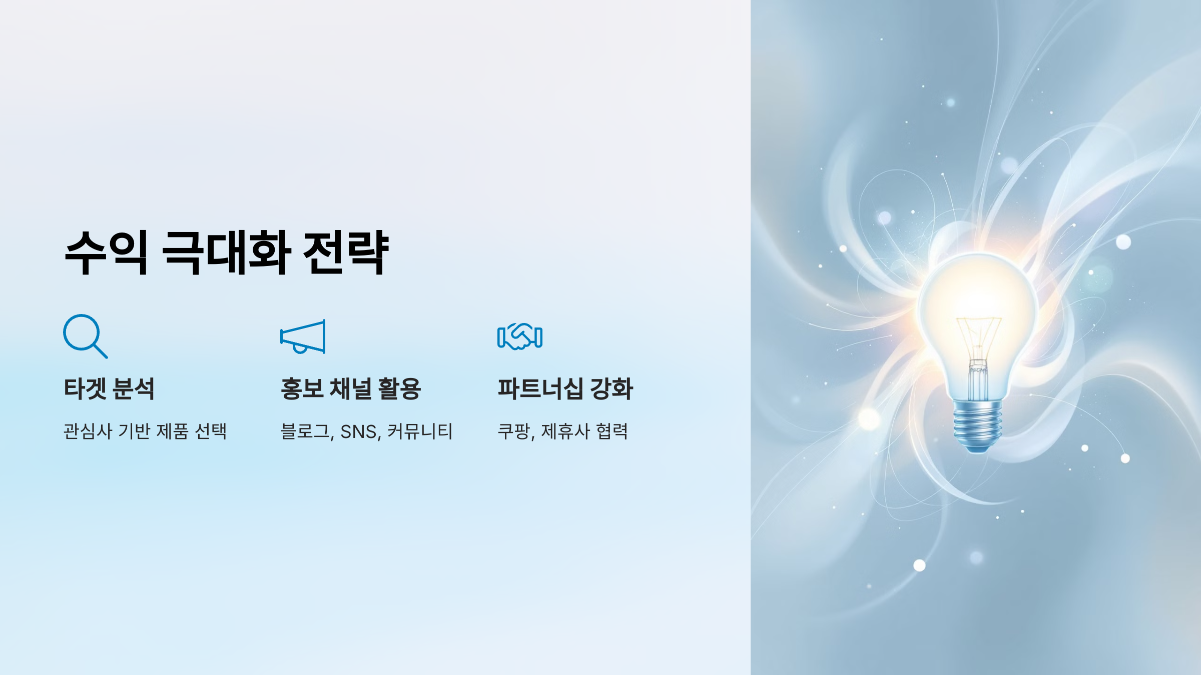 수익을 극대화하려면 커미션이 높은 제품 위주로 홍보하거나, 여러 개의 링크를 다양한 채널에 배포하는 방법도 좋아요.