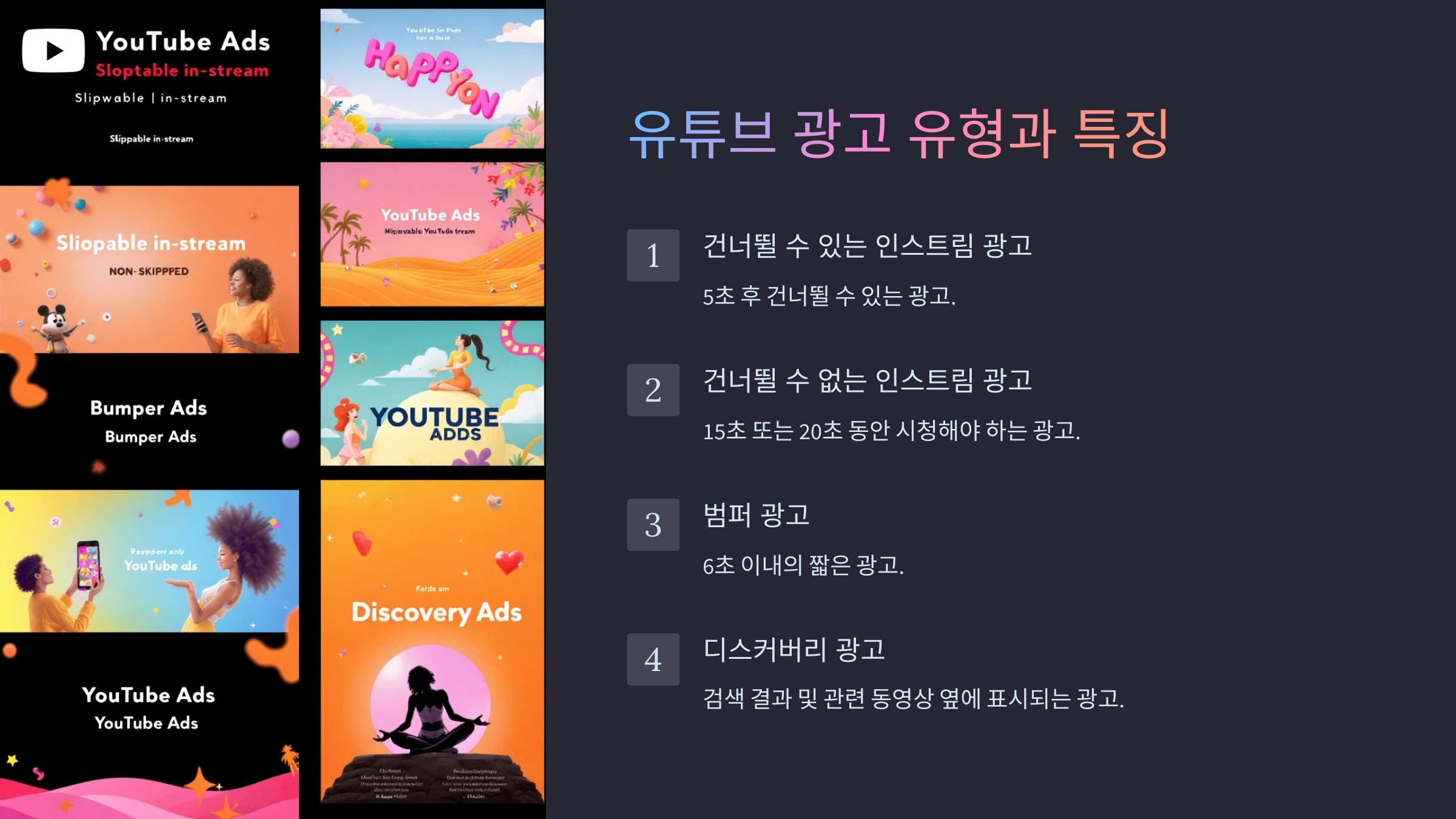 각 광고 유형은 목표에 따라 적절히 선택해야 해요. 예를 들어, **브랜드 인지도**를 높이고 싶다면 스킵 불가 광고나 범퍼 광고가 효과적이고, **전환율(구매, 클릭)**을 높이고 싶다면 디스커버리 광고나 오버레이 광고가 적합해요.