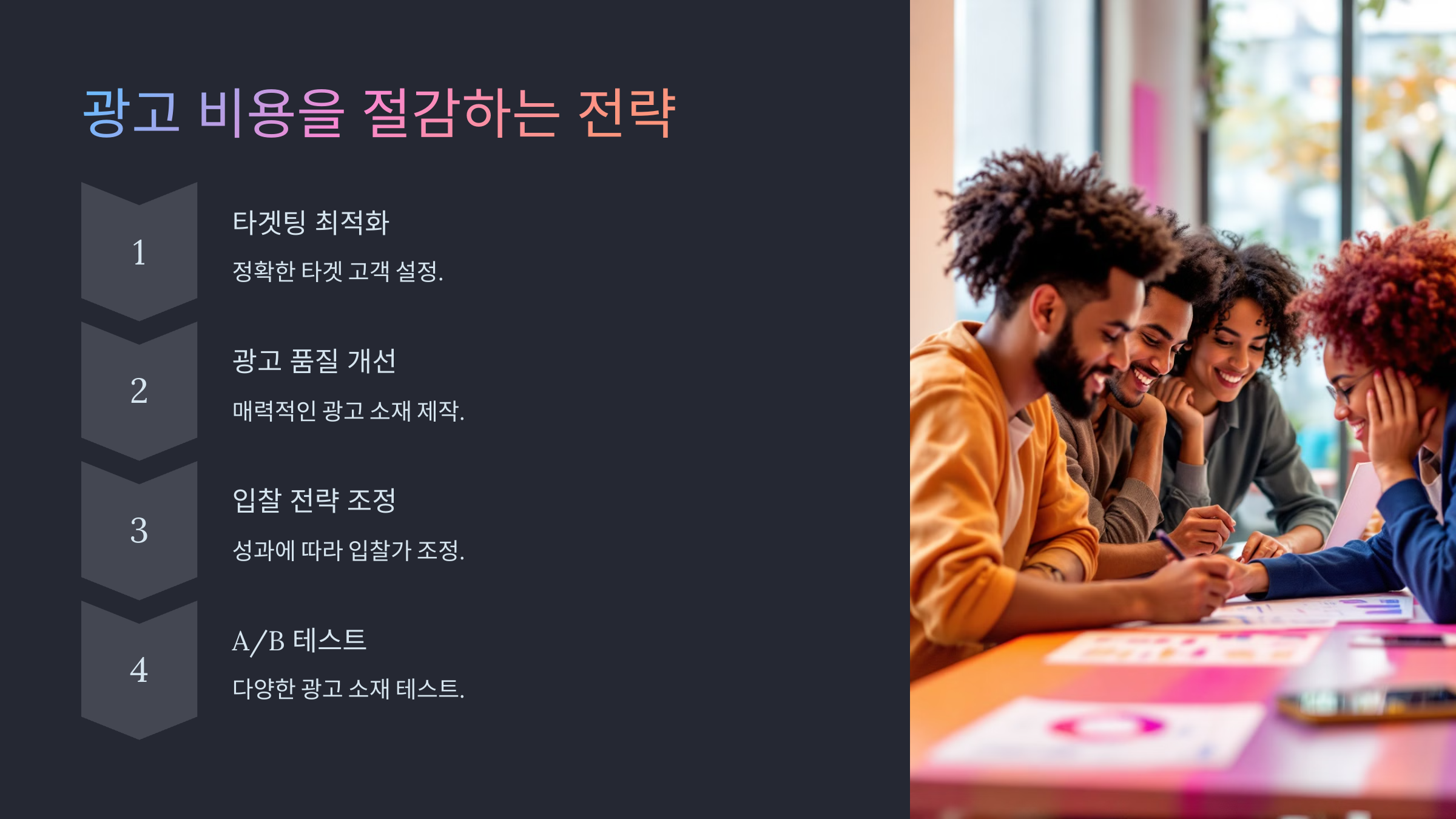 | A/B 테스트 | 여러 가지 광고 소재를 테스트하여 가장 효과적인 광고 유지 |