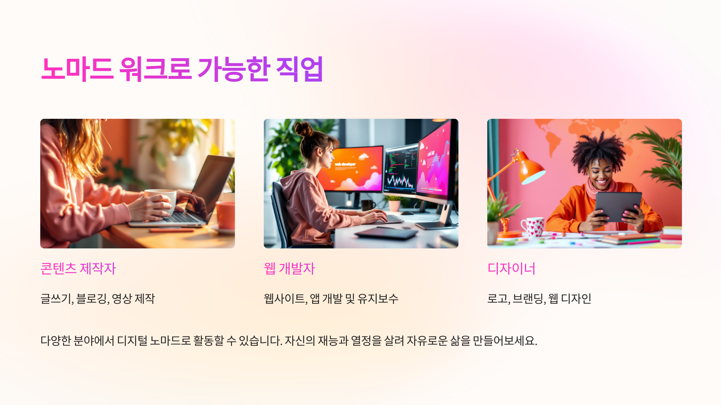 노마드 워크가 무엇인지 이해하셨다면, 이제 **어떤 직업이 노마드 라이프에 적합한지** 살펴볼까요? 💻