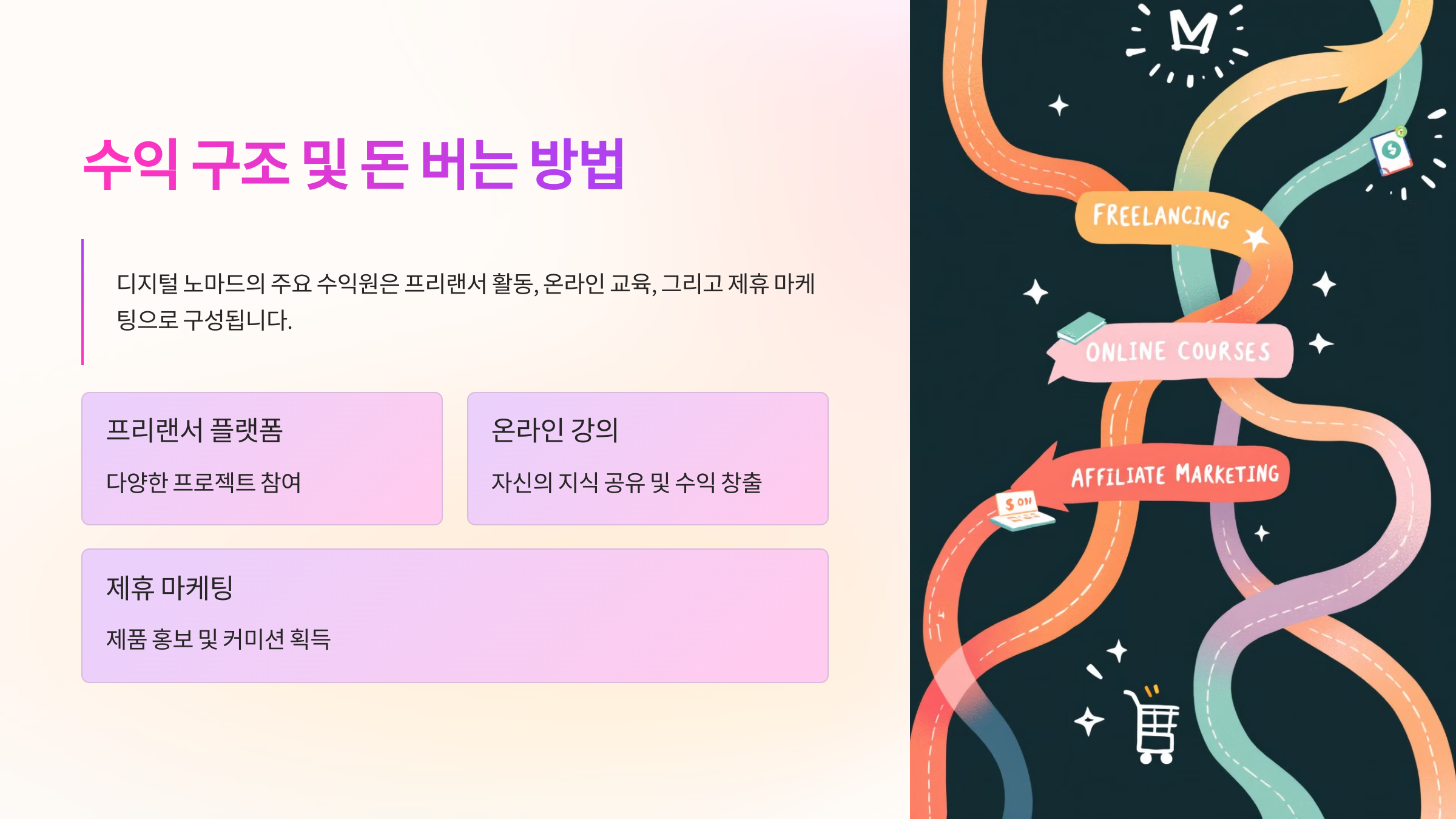 다음으로는 **노마드 워크에서 돈을 버는 방법과 수익 구조**를 살펴볼까요? 💰