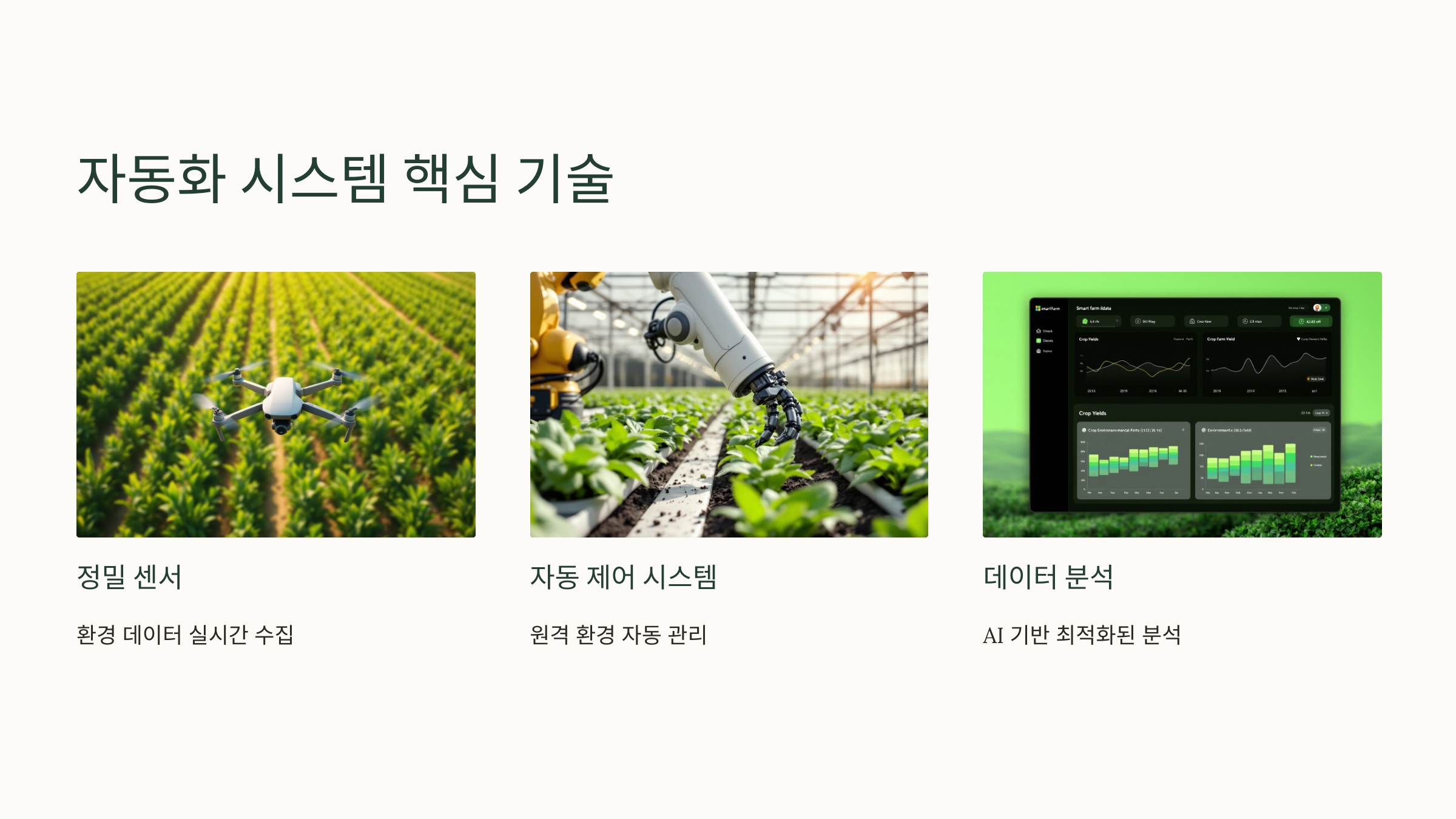 | AI 기반 빅데이터 분석 | 과거 데이터 분석을 통해 최적의 재배 환경 추천 | 수확량 예측, 생산성 극대화 |
