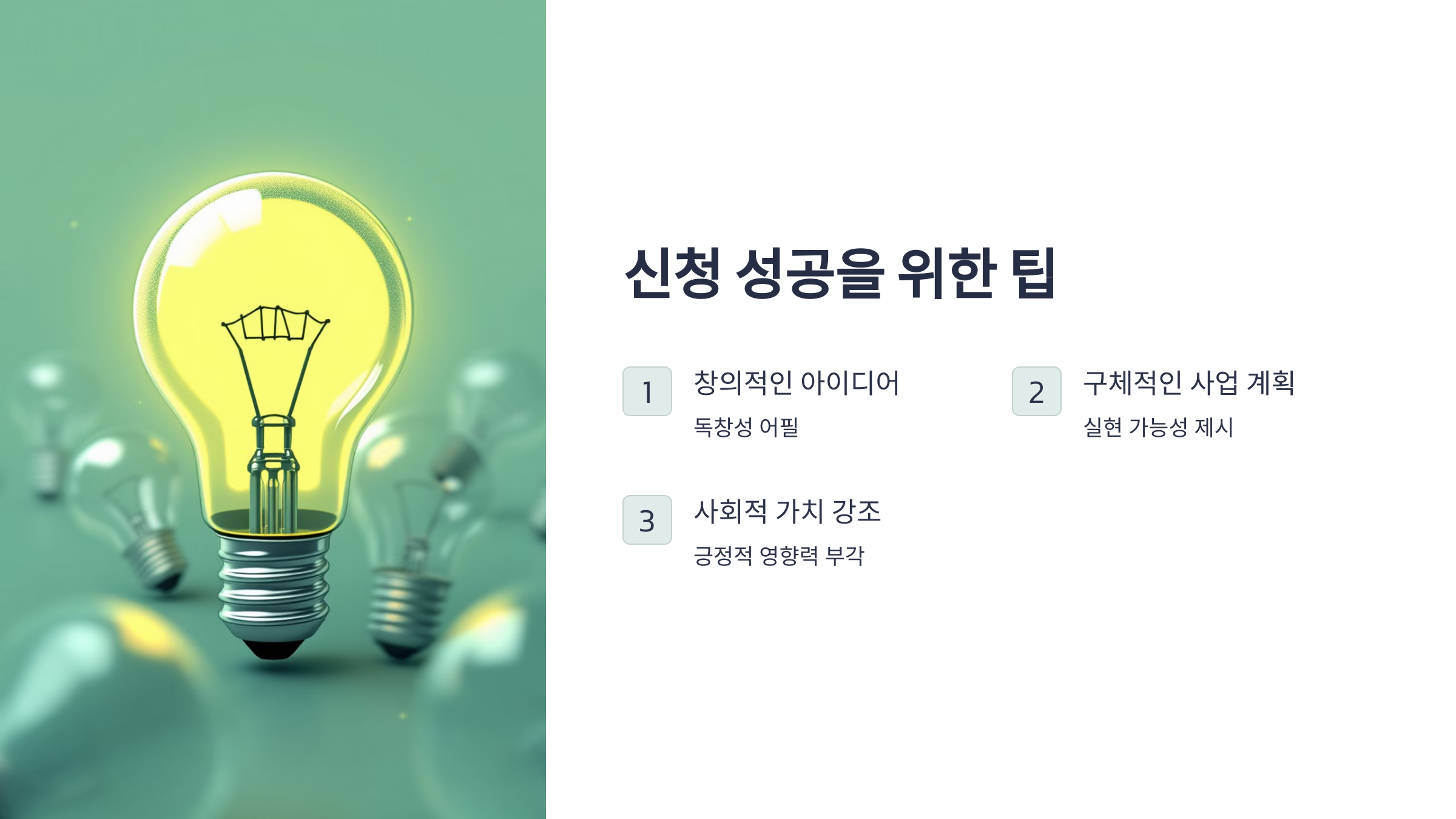 - 사회적 가치 창출: 친환경, 사회적 기업 관련 사업이라면 가산점을 받을 가능성이 커요.