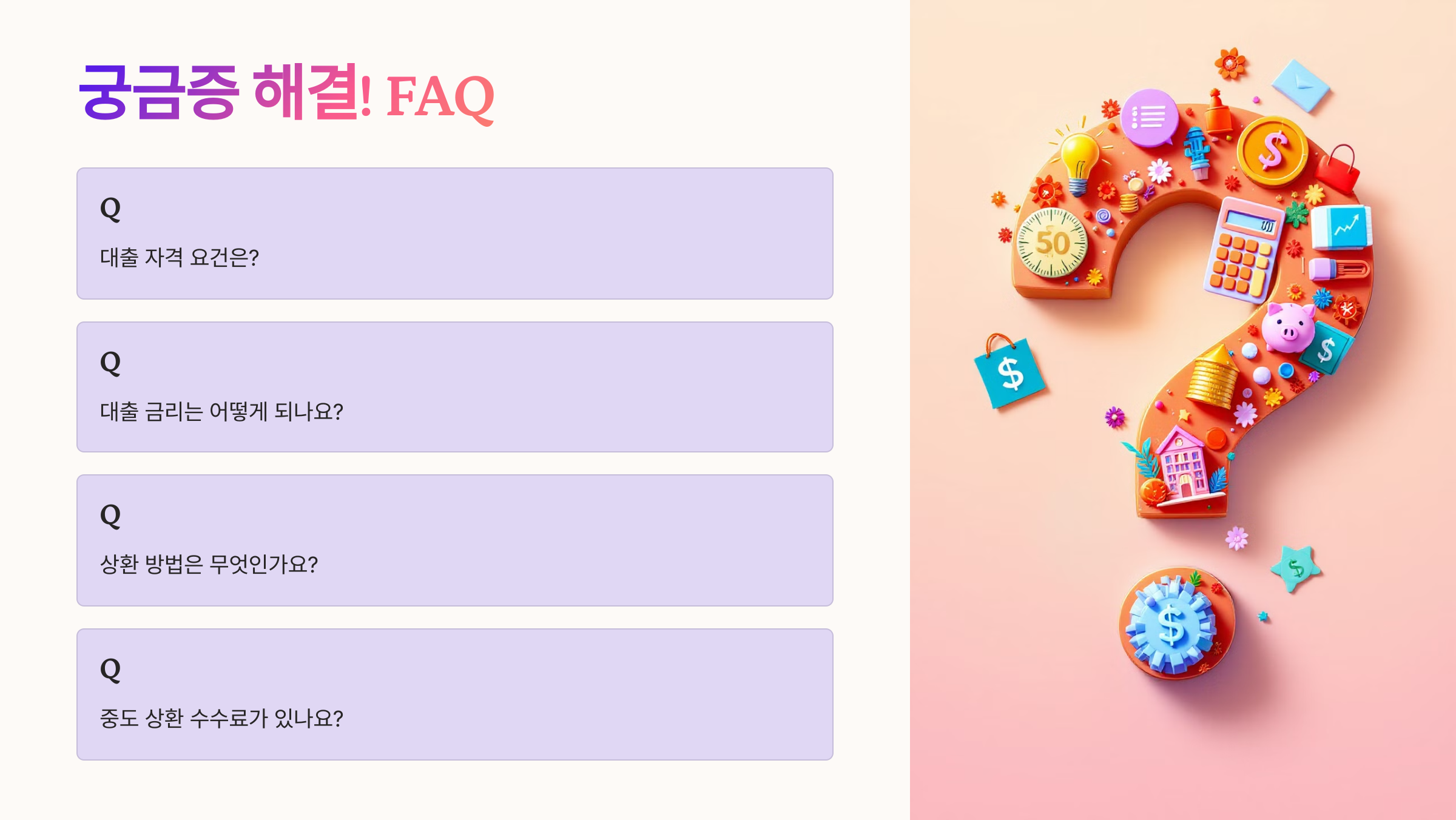 A6. 네, 조기 상환이 가능해요. 하지만 일부 대출 상품은 **중도상환 수수료**가 부과될 수 있으니 신청 전에 확인하세요.