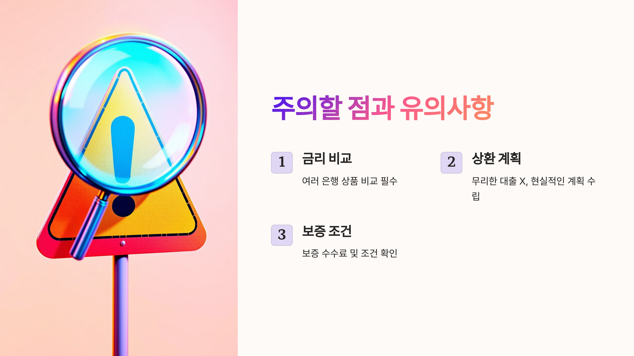 소상공인 대출을 받을 때는 **대출 조건과 상환 계획을 철저히 고려해야 해요.** 잘못된 대출 사용은 사업에 부담이 될 수 있으므로, 반드시 아래 사항을 숙지하세요. ❌