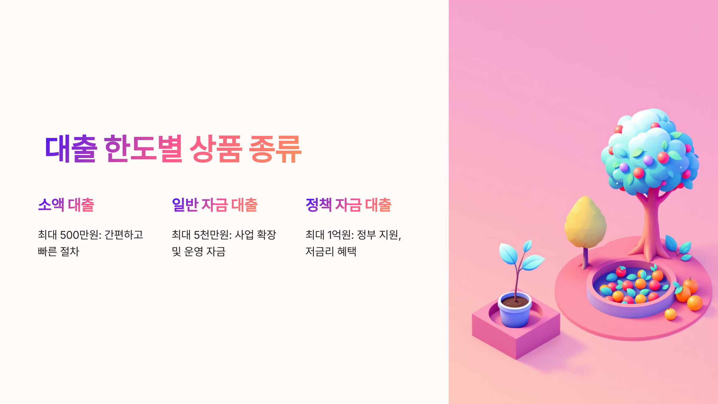 소상공인 대출은 **대출 한도에 따라 다양한 상품이 제공**돼요. 대출을 받을 때는 금리, 상환 기간, 조건 등을 꼼꼼히 따져보고 본인에게 맞는 상품을 선택해야 해요! 💡