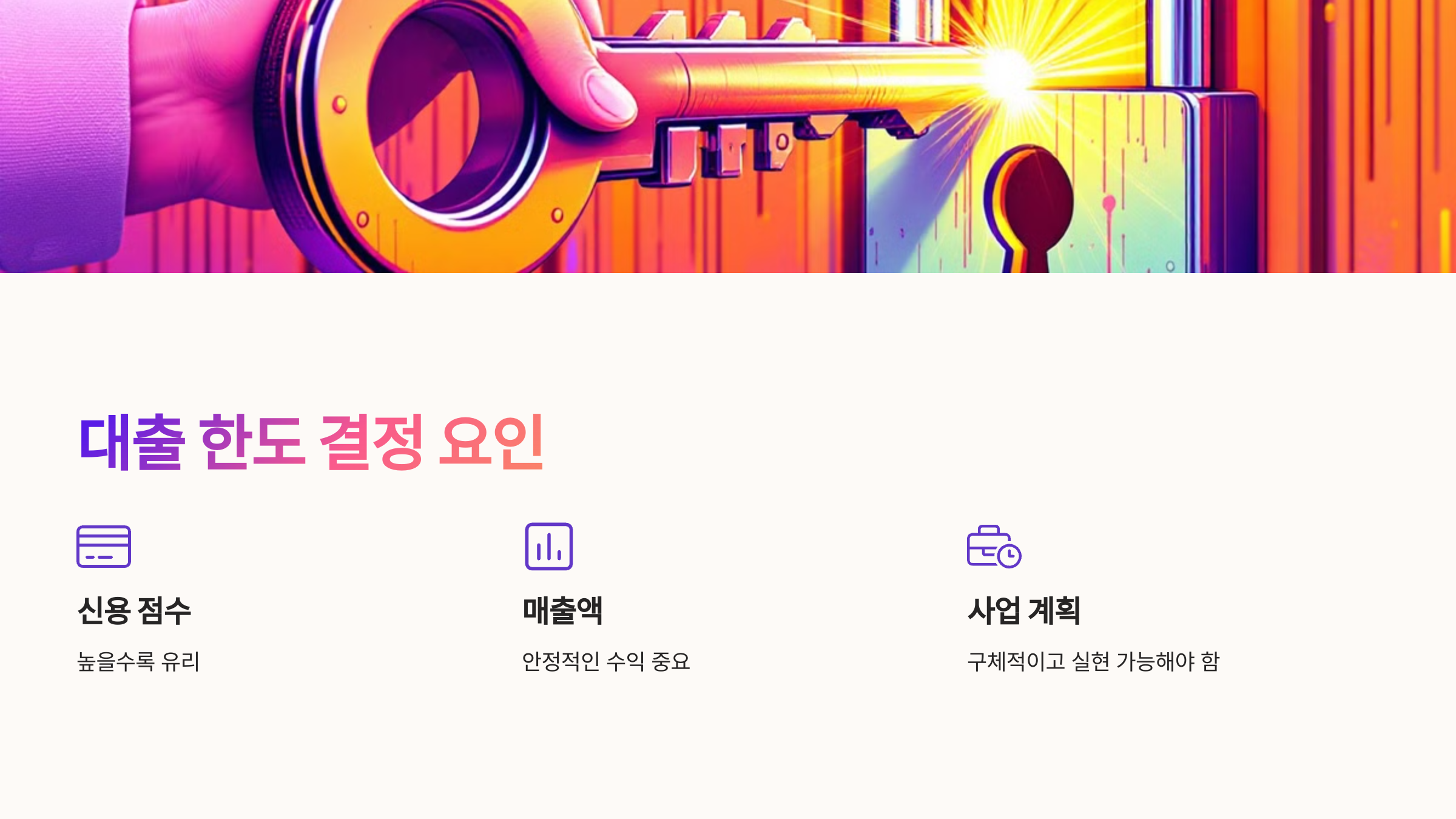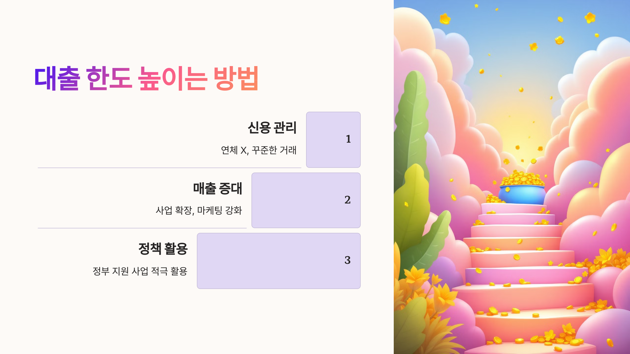 대출 한도를 높이려면 **신용 등급과 사업 실적을 꾸준히 관리하는 것이 중요해요!** ✅