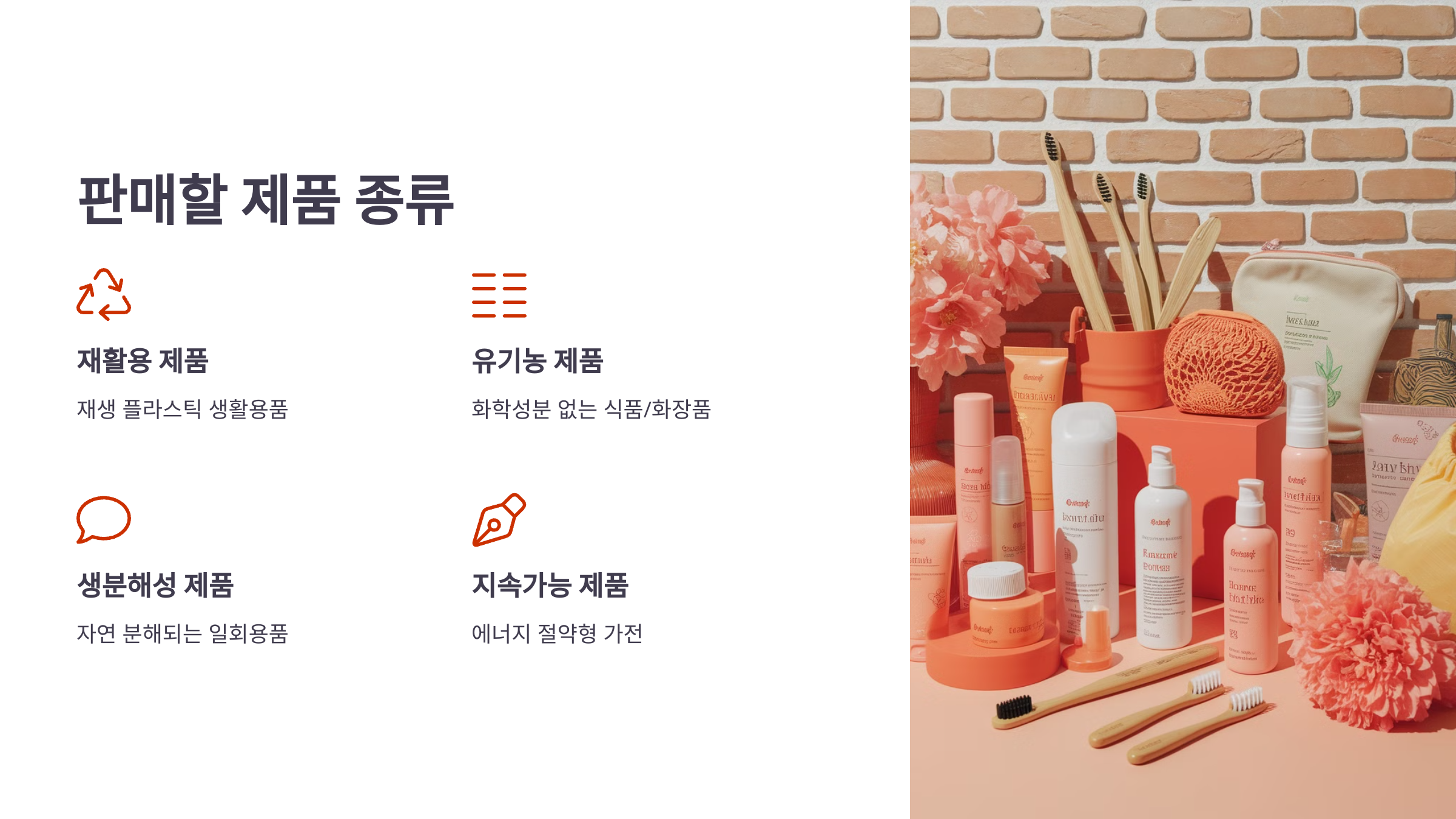 일반적인 플라스틱이나 일회용품이 아닌, 재사용 가능하거나 생분해되는 제품을 판매하는 것이 핵심이에요. 대표적인 친환경 제품 카테고리는 다음과 같아요. 👇