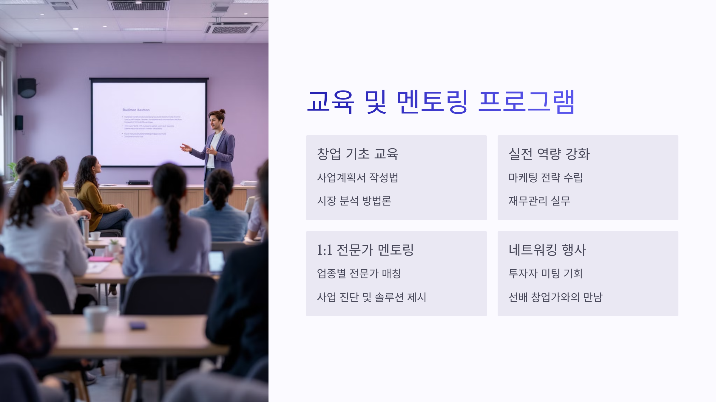 | 기초 창업교육 | 창업 절차, 상권 분석, 사업자 등록 교육 |