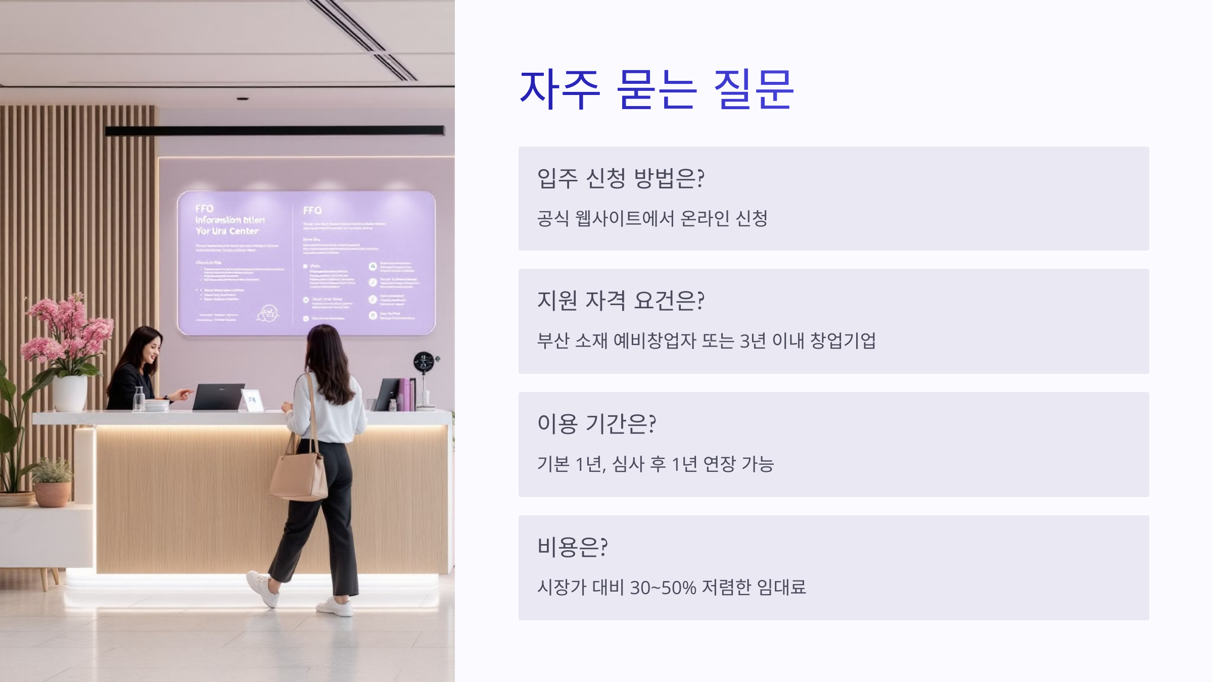 A3. 부산경제진흥원 홈페이지에서 온라인 신청이 가능하며, 센터 방문 상담도 가능해요.