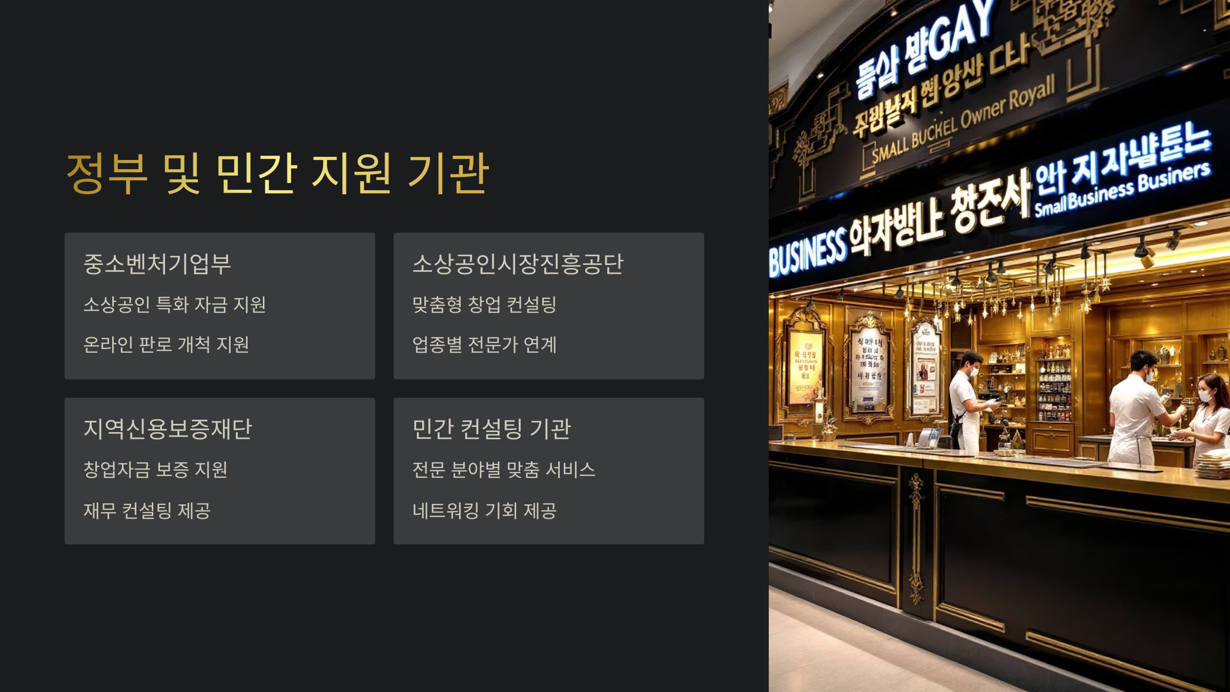 | 창업진흥원 | 창업교육, 마케팅, 경영 컨설팅 | 무료 또는 정부 지원 |