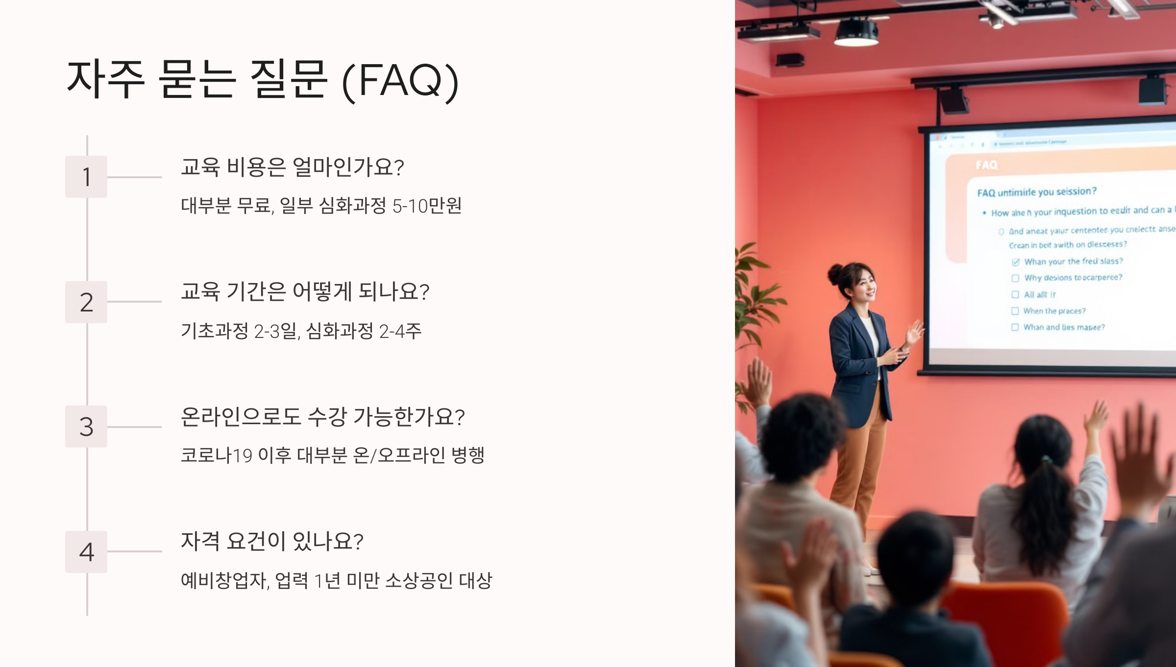 A8. 교육으로 기초를 다진 뒤, 추가적인 시장조사와 컨설팅을 병행하면 창업 성공률을 높일 수 있어요!
