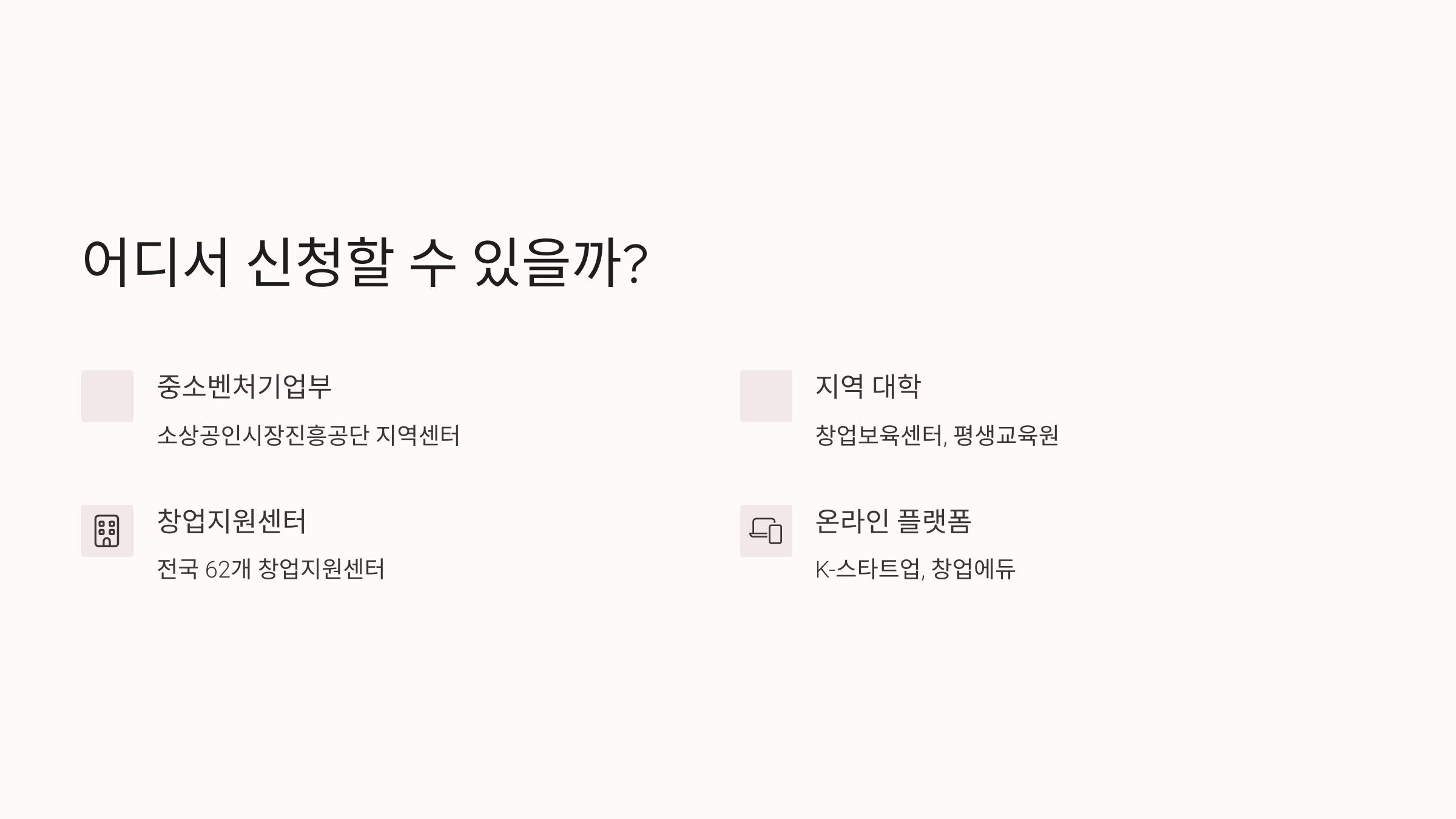 | 지자체 및 상공회의소 | 지역별 창업 지원센터, 상공회의소 |