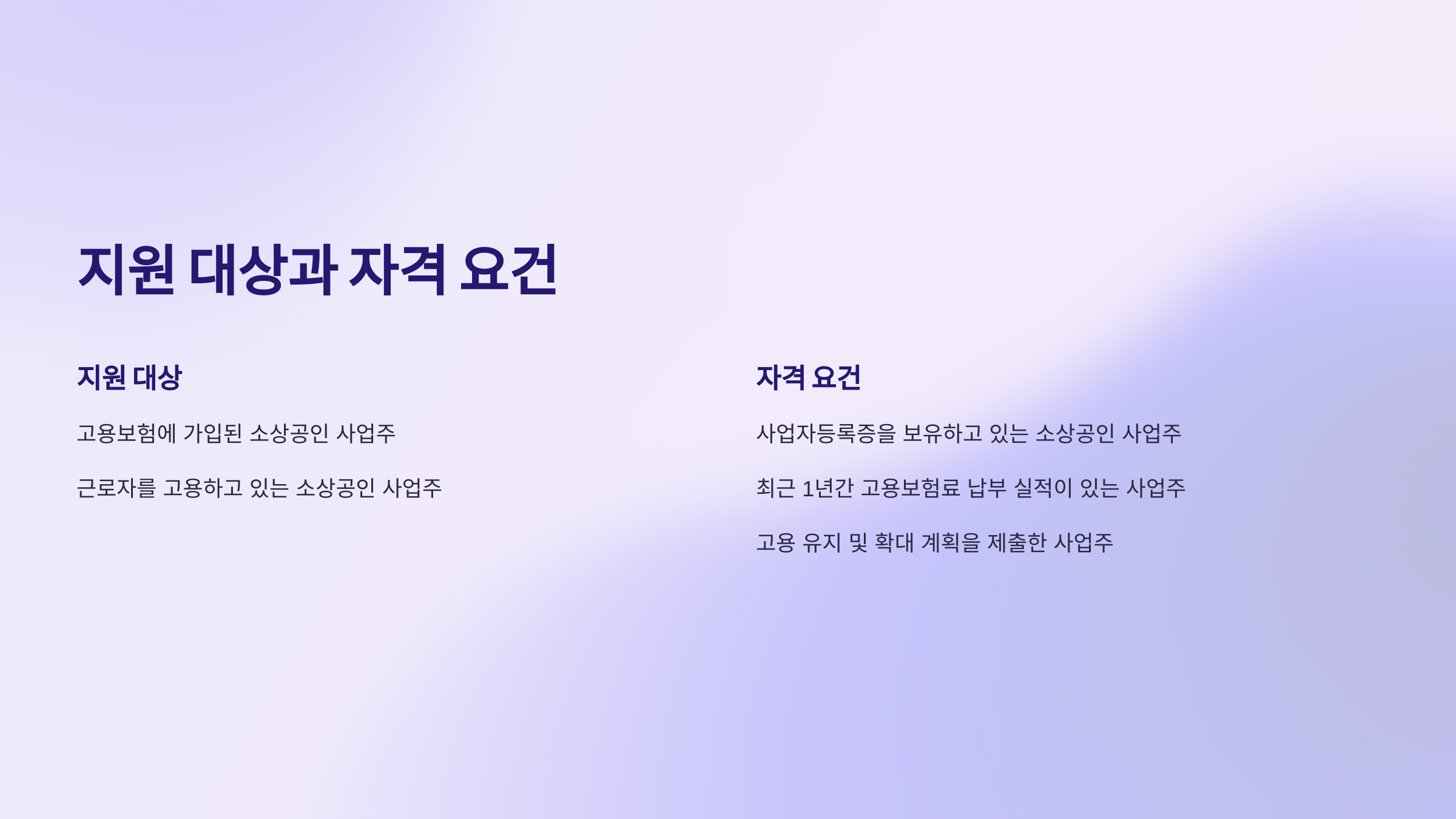A1. 직원 수 10인 이하의 소규모 사업장이나 소상공인이 주요 신청 대상이에요. 고용 보험에 가입되어 있어야 신청할 수 있어요.