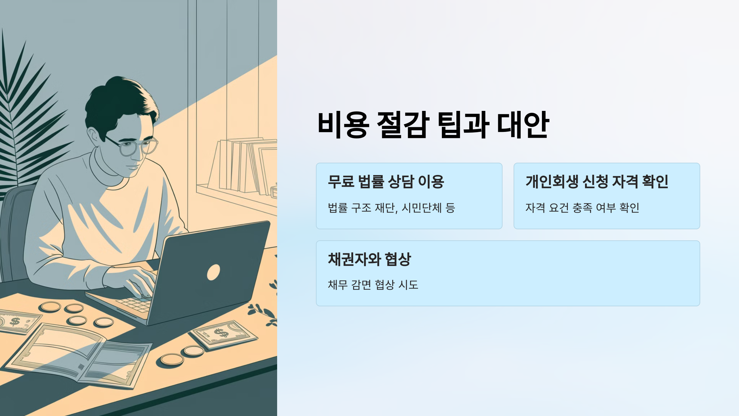 개인회생 과정에서 비용이 부담된다면, 몇 가지 절감 방법과 대안을 고려해 볼 수 있어요.