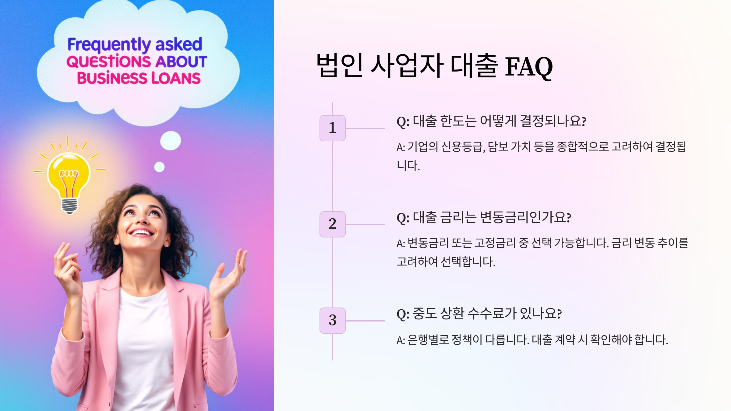 - 연대보증: 일부 법인 사업자 대출은 대표이사의 연대보증이 필요할 수 있습니다.