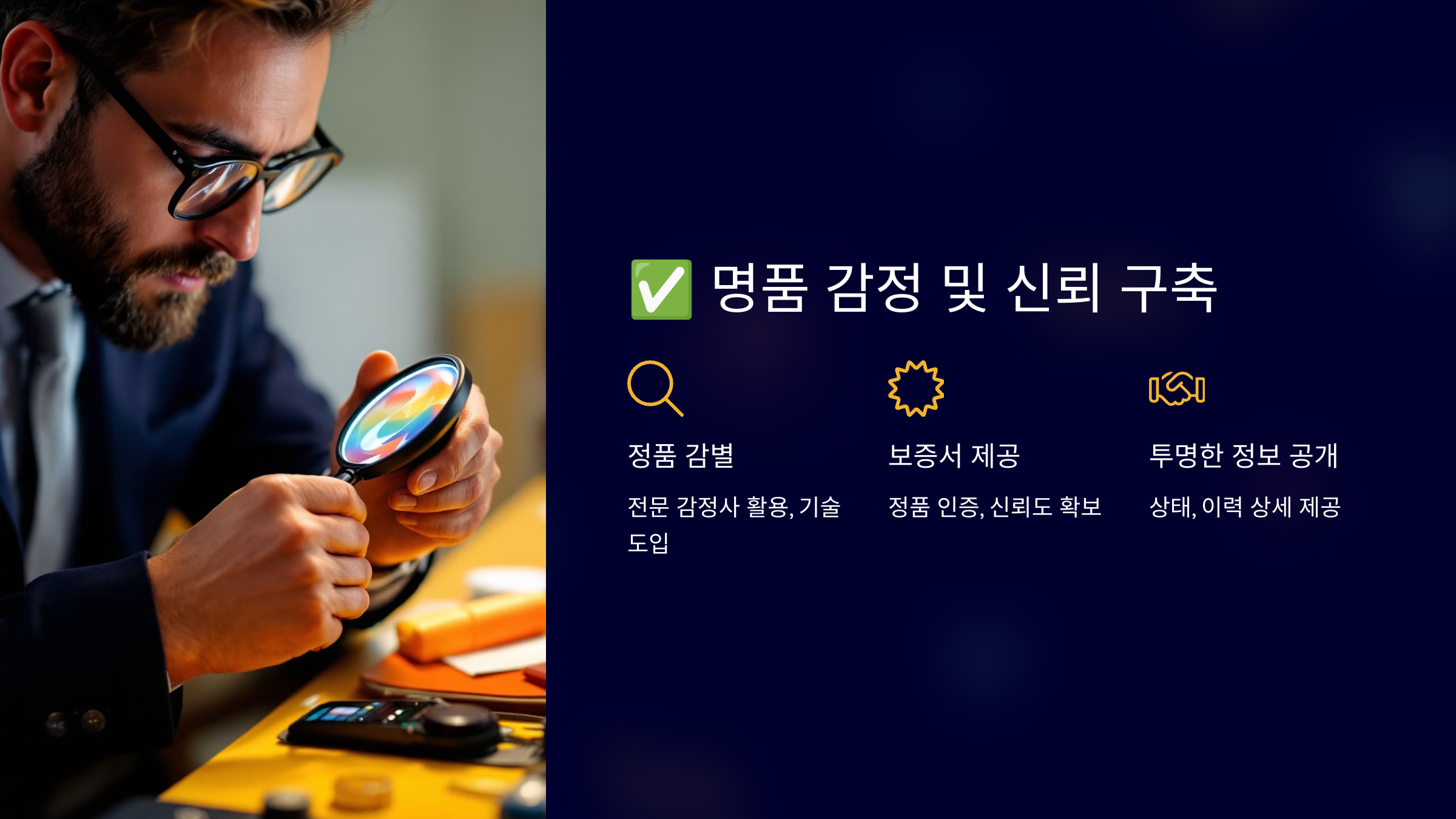 | ✅ 정품 인증 중요성 증가 | 가품 유통 방지를 위한 감정 서비스 필수 | 신뢰 구축이 핵심 |