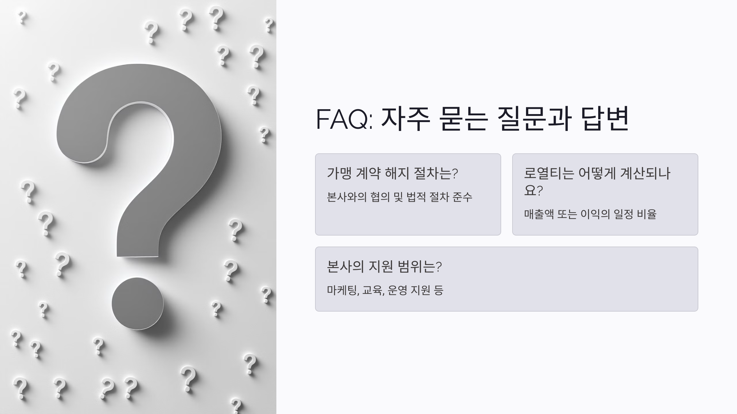 다음 섹션에서는 프랜차이즈 계약과 운영에 대한 자주 묻는 질문(FAQ)을 정리했어요! 📌