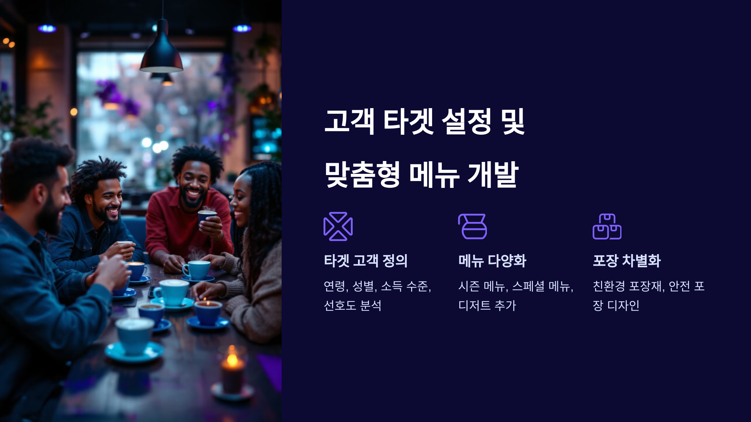 | 타겟 고객 | 특징 | 추천 메뉴 |