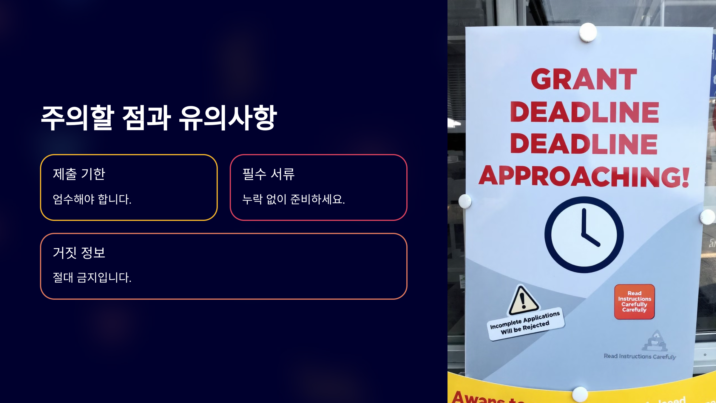 중소기업 지원 사업을 신청할 때 **몇 가지 중요한 유의사항을 지키지 않으면 선정이 어렵거나 지원금이 회수될 수 있어요.** 아래 내용을 꼭 확인하세요! ❌