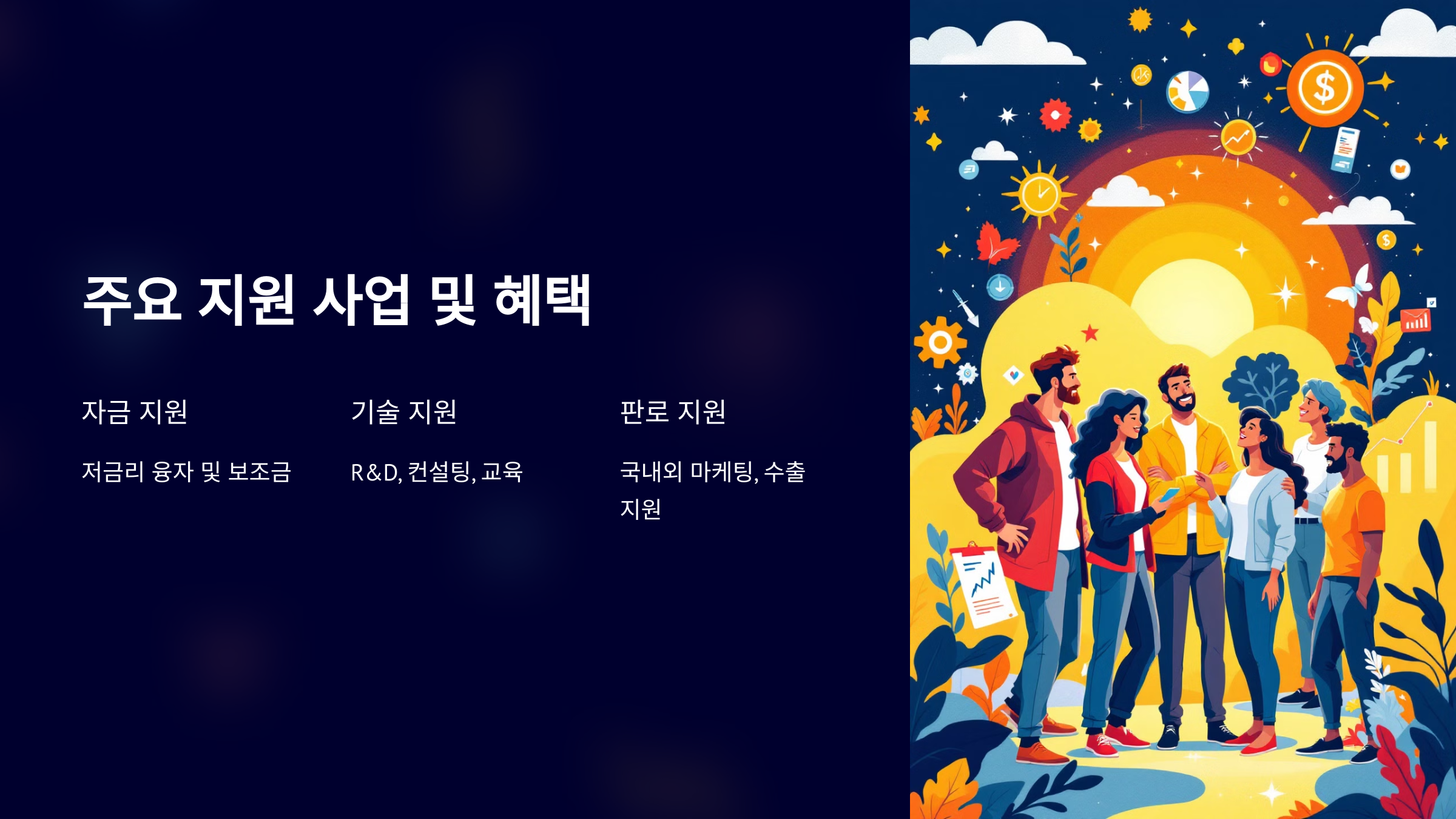 | 재정 지원 | 저금리 대출, 창업 지원금, 연구개발 보조금 |