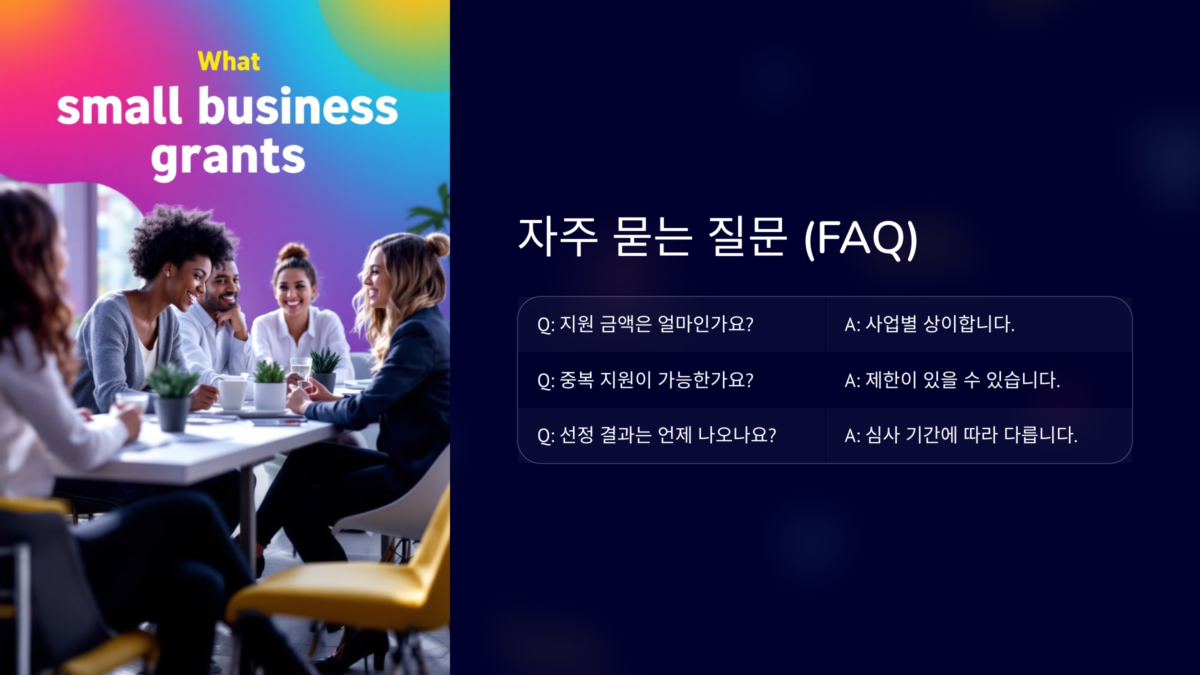 A3. 아니요. **보조금(무상 지원금)은 상환할 필요가 없지만, 대출 형태의 지원금은 일정 기간 후 상환해야 해요.** 신청 전에 지원금의 성격을 반드시 확인하세요.